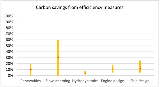 In [18], Bouman et al. discuss six major categories for achieving the most significant potential CO2 emission reductions. Namely, these are propulsion and power, including energy-saving devices, hull design, economy of scale, speed, weather forecasting and planning, fuels, and alternative energy sources. According to their findings, all six reduction scenarios in the shipping industry will need to be executed to achieve almost net-zero CO2 emissions.