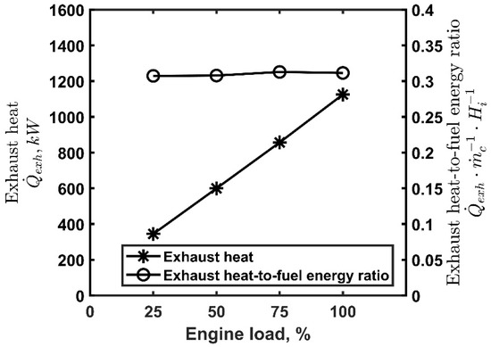 Exhaust heat and exhaust heat-to-fuel energy ratio, , as a function of the engine load, 1500 rpm.