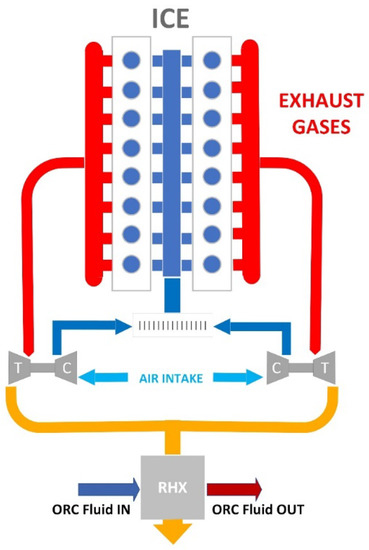 The exhaust heat is recovered by a RHX specifically designed for this purpose. A schematic representation of the internal combustion engine coupled with the RHX is reported in Figure 2. Heat sources such as coolant fluid, with temperatures in the range 80–90 °C, and lubricant, with temperatures between 80 and 120 °C, were not exploited. In fact, these temperatures being close to the ambient one, harnessing them is not economically convenient [38,39].