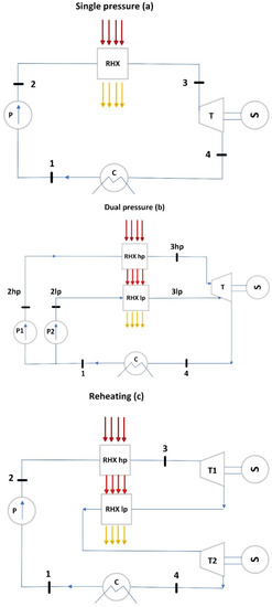 - Single-pressure, Figure 3a: It consists of a pump (P), an evaporator (RHX), a turbine (T), and a condenser (C).
