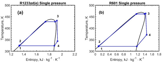 Temperature–entropy chart for the single-pressure ORC configuration: (a) R1233zd(e) and (b) R601. The numbers in the figures represent the thermodynamic states of the fluids.
