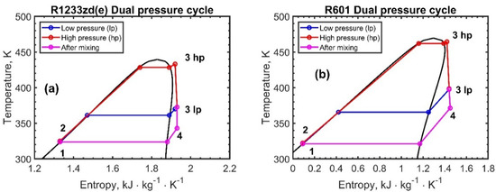 Temperature–entropy chart for the dual-pressure ORC configuration: (a) R1233zd(e) and (b) R601. The numbers in the figures represent the thermodynamic states of the fluids.