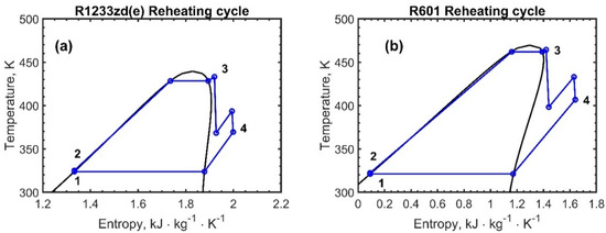 Temperature–entropy chart for the reheating the ORC configurations: (a) R1233zd(e) and (b) R601. The numbers in the figures represent the thermodynamic states of the fluids.