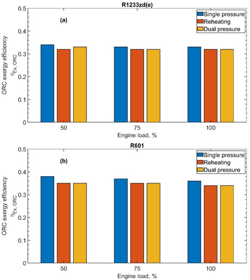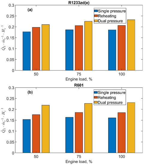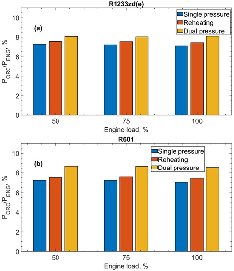 is affected by the ORC system configuration, as previously reported in Table 2, and in Figure 8, refers to the fuel energy. Compared with single-pressure, the reheating and dual-pressure cycles allow to recover a higher amount of heat, with the latter showing the highest values, and these values are slightly affected by the engine load. In fact, considering R1233zd(e), the ratio for the single-pressure configuration is almost constant with the engine load and equal to 0.180, whereas, for the reheating and dual-pressure, a slight increase with the engine load is observed, from 0.198 to 0.206 and from 0.210 to 0.232, respectively. A comparable occurrence is displayed for the R601 fluid.