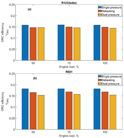 The ORC thermodynamic efficiency is shown in Figure 9a,b for R1233zd(e) and R601, respectively. The efficiency of the ORC plant is nearly constant with the engine load for a defined ORC layout. This is due to the constant maximum cycle pressure and temperature values, the last of which was achieved by optimizing the working fluid mass flow rate. In fact, the Rankine cycle was kept unchanged with the engine load, i.e., different exhaust gas mass flow rate and temperature, adjusting the Rankine cycle working fluid mass flow rate to attain the target temperature at the RHX outlet. In this case, it can be observed that the single-pressure cycle shows the highest efficiency with values of 16.0% for R1233zd(e) and 18.2% for R601. In fact, reheating and low pressure circuits in the case of dual-pressure both operate at a lower pressure level, constrained by the exhaust gas temperature value at the outlet of the first heat exchanger. The amount of heat recovered in the low-pressure circuit is transferred to the working fluid at a lower average temperature, and consequently, the thermodynamic efficiency slightly decreases. Though this can appear as a negative result, it should be considered that, in ORC systems, where the heat is recovered and not produced by the combustion of a fuel, the focus is mainly on the ORC power output compared to on the system efficiency.