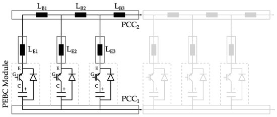 As a first step towards homogenizing the emitter inductances within the PEBC module packages, the connection of the PEBC module internal busbars to the common busbar is modified towards a common star point connection via short cables with high-current carrying capability. The added cable inductances are LE1′, LE2′ and LE3′ (LEj’), resulting in the overall inductances from each PEBC module’s emitter terminal to the PCC2, as described in Equation (10).