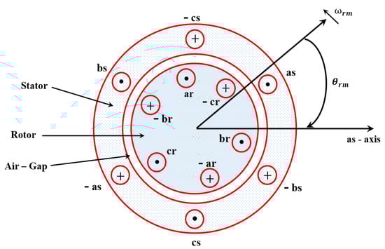 To solve and simplify the computation of the three-phase IM performance, contemporary research analyzes the transient and steady-state performance of three Ims with a direct-quadrature-zero (dq0) stationary motor model [21,25,26]. As it can accurately represent the real-time motor model, a dq0 reference frame is chosen in this study to create the motor simulation model. The relationship between the rotor dq0 and the abc stator axes is shown in Figure 2. The mechanical rotor speed is denoted by ωrm, and the reference frame speed is represented by ω. The transformation from abc to dq0 is analyzed using stationary and synchronously revolving frames. Similar to those typically used for supply networks, the stationary rotating frame has a speed frame that produces a value of ω = 0. When the synchronous reference frame revolves in the same direction as the rotor revolution, the speed frame becomes ω = ωs. The matrix below contains their inverses and the transition from the abc to the dq0 reference frame [27].