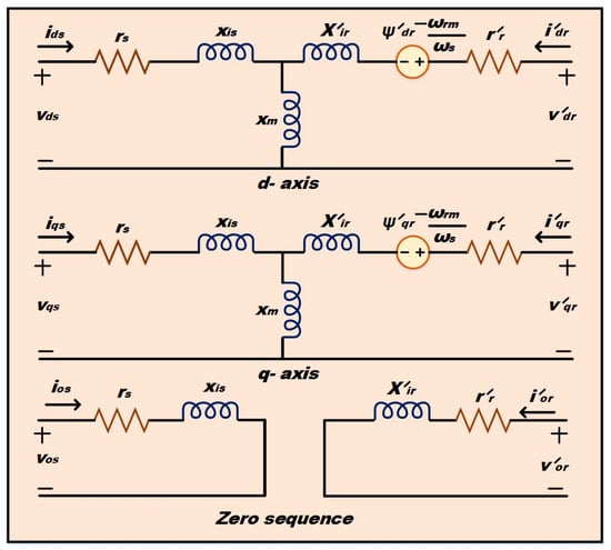 where variable x = the 3-φ IM’s phase voltage, current, or flux linkage. The stator voltages are converted to the dq0 voltages into a matrix form that includes flux linkages, currents, and voltages of the dq0 reference frame to produce the dq0 voltages [28].