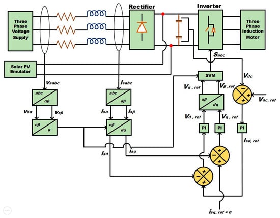 Electric motors are used in many driving components worldwide, accounting for 40% to 50% of all electricity demand [1]. Seventy percent of the electricity needed to run industrial loads is provided by three-phase IMs [2]. Due to their appealing qualities, such as low cost, straightforward design, excellent reliability, and ease of maintenance, electric motor sales have climbed to 85% [3,4,5]. Although direct current (DC) motors are frequently seen in applications involving variable speed operations because of how simple it is to control torque and field flux with armature and field current, these motors possess the drawback of having a commutator and brushes that could cause corrosion and necessitate regular maintenance [6]. Due to their high output power, toughness, robustness, efficiency, affordability, capacity to tolerate hazardous or severe working situations, and ruggedness, IMs do not experience DC motor difficulties [7]. The abrupt variation in load, which uses a significant amount of electricity and raises the cost of energy, impacts the functioning of three-phase IMs [8]. To regulate speed and preserve high efficiency, a variable speed drive (VSD) may be employed [9]. Moreover, the controller and switching technique employed in VSD significantly impact the achievability of high efficiency and reliability for IMs [10,11]. Pulse-width modulation (PWM) techniques are often used to control the switches of voltage source inverters (VSIs), as well as the frequency and output voltage of IMs [12]. One of the better approaches for VSI is the SVM switching approach, which has reduced switching losses and the capacity to reduce the harmonic output signals generated by inverters [13].