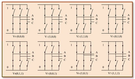 Eight switch variables can be created using the inverter’s six IGBTs. Six switch variables—V1, V2, …, V6, and the last two—are zero vectors chosen for the three upper IGBT switches. The on and off patterns of the lower IGBT switches are the opposite of those of the higher switches. Figure 4 displays the eight switching vectors of the SVM [34].