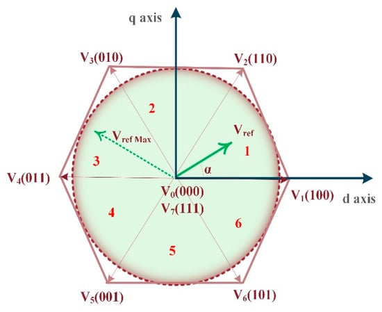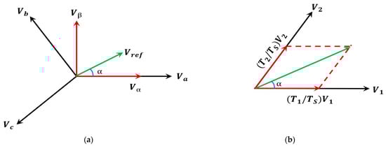The output waveform of the inverter is split into six hexagonal sectors, according to the SVM’s working principle. The sector angle is 60° apart, and every sector is between two voltage space vectors (Figure 5) [35]. The SVM approach receives a 3-φ voltage (Va, Vb, and Vc) with a 120° angle among the 2-φ and transforms it into 2-φ (Vα and Vβ) with a 90° using Clark’s transformation (Figure 6a).