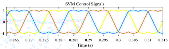 Alternating the zero-vector sequence, the asymmetric sequence, the maximum current not switched sequence, and the right aligned sequence are the four different types of switching patterns. To reduce device switching frequency, all switching patterns must fulfill the following two requirements. Merely two switches in the same inverter leg are used to switch from one switching state to another. To minimize the switching frequency, one of the switches must be turned off if the other is activated. The least amount of switching is necessary to move Vref from one sector to the next to minimize switching losses. The optimum strategy, according to research, is the symmetric sequence method, since it minimizes switching losses. The generation of the SVM signal and the inverter output voltages and a comparison of the duty ratio waveform’s three signals with the triangle waveform is shown in Figure 7. This comparison assumes that S is ON if VDutyRatio > Vtriangle; otherwise, S is OFF.