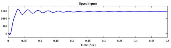 Each controller must successfully uphold the three requirements mentioned earlier and offer reliable control inside its application domain. The software platform MATLAB/Simulink has been used to implement the entire system. The SVM method is used to evaluate whether a PV system connected to a grid can improve power quality at the consumer terminals. Figure 7 depicts the creation of the SVM signal. The voltage waveforms and the current waveform share some phase and are both sinusoidal, as shown in Figure 8. Figure 9 illustrates how the speed of 1425 rpm was achieved while the load torque remained constant at 3.0 N-m, as shown in Figure 10. In accordance with carrier frequencies of 1 kHz and an MI of 0.9 (Figure 11), Figure 12 displays an FFT analysis of the current and voltage in the system under consideration. The THDi and THDv values were, respectively, 1.10% and 1.22%. Figure 13 depicts the voltage in the dc-link capacitor.