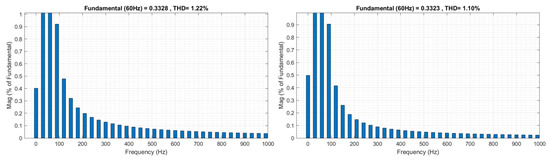 Figure 17 depicts the voltage and current waveform with an FFT analysis with an MI of 0.6. Similarly, Figure 18 and Figure 19 illustrate the voltage and current waveforms with FFT analysis for an MI of 0.9 using SPWM and SVM inverters.