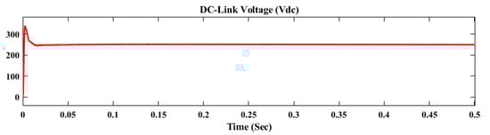 For this reason, it was assumed that the grid phase voltage was 415 V with a frequency of 50 Hz and dc-link voltages of 250 V. The practical response to a dc-link voltage and SVM switching pulse is illustrated in Figure 15. The test results clearly show that the SVM-based VOC controller optimizes the dc-link voltage.