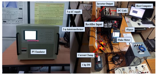 The efficiency of the suggested VOC-SVM control-based PI controller, shown in Figure 3, has been tested using a suitable configuration. Its primary components are a Fluke power quality analyzer, three-phase inverter, dSPACE kit, power analyzer, and PV simulator. A PVS1010 PV emulator with dc programming is used to determine the panel properties. A real-time dSPACE DS1104 controller interface controls the system by conditioning each field signal. A dSPACE platform, shown in Figure 14, is used to integrate the Simulink model with the external hardware. A D/A converter is used to interface the inverter gating signals with dSPACE. A dSPACE DS1104 board is used to run Simulink, which has been used to implement the simulated design modelling. The suggested control’s main benefit is the ability to precisely adjust the THD and dc-link voltage. The testing was carried out using the MATLAB/Simulink interfaced dSPACE platform to realize the adequate performance of a VOC-SVM control-based grid-connected PV system.