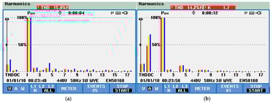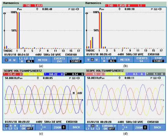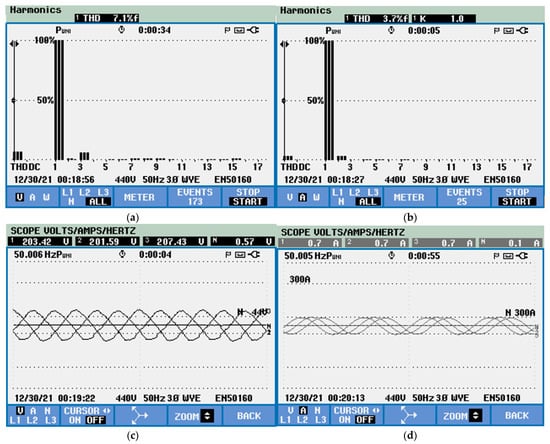 According to the IEEE 519 standard and Figure 14, an SVM based on ripple control was used to achieve reduced THD and described with the FFT spectrum of grid current under steady-state and dynamic operating circumstances. The waveforms were observed using a Fluke-43 spectrum analyzer with online numerical value illustration. The experimental voltage and current waveform of an inverter with a THDi and THDv for a modulation index of 0.3 are shown in Figure 16a–d.