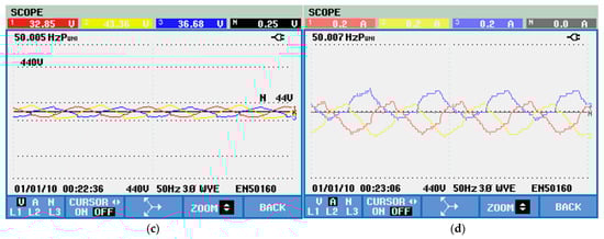 (a) Voltage THD (b) Current THD (c) Voltage (d) Current of a three-phase SVM inverter (MI = 0.6).