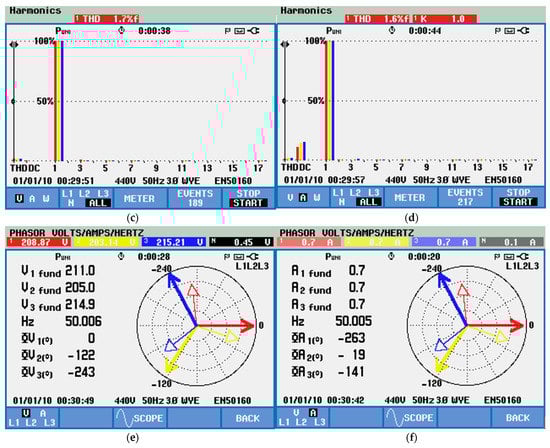 (a) Voltage (b) Current (c) Voltage THD (d) Current THD (e) Voltage and (f) Current Phasor Diagrams of a three-phase SVM inverter (MI = 0.9).