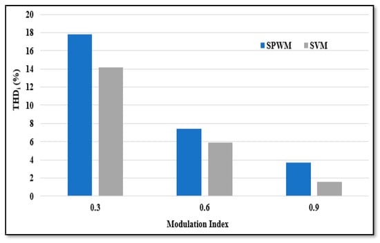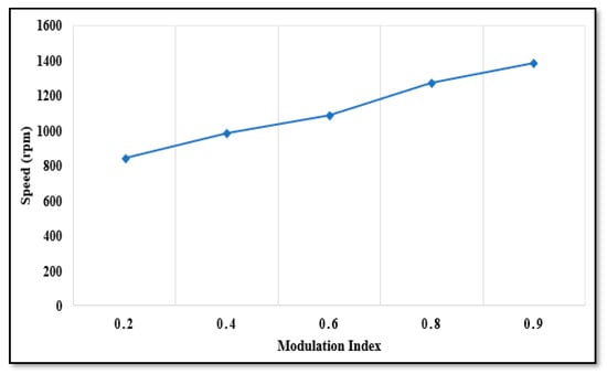 Figure 16, Figure 17, Figure 18 and Figure 19 illustrate output current waveforms with various modulation indices for comparison. It can be seen that when the MI is fixed at 0.9, the output current waveform is more sinusoidal. THDi and THDv results for various modulation indices are similarly displayed. The optimum output signal is created by increasing the MI with the SVM technique, as can be seen in Figure 20. It is also evident that increasing the MI results in a decrease in current and voltage harmonics. Figure 21 shows the change in speed with MI. The comparative analysis of the hybrid system with THDs with different modulation indices is shown in Table 1.