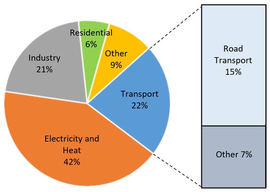 Greenhouse gas emitting energy sources are responsible for global warming. Thus, replacing such energy sources with clean and renewable sources of energy has become crucial during the past few decades. According to Figure 1, transportation is one of the significant emission sectors, contributing 22% of the total emissions. Road transport accounts for three-quarters of transport emissions and 15% of total emissions [1]. For example, in the UK, the total emission from buses is around 4.3 million tons if we assume that the average emission rate is 822 g per km for each bus [2]. That is why public transport has become an attractive area for potential emission reduction [3]. Electrifying transportation is a way to address both urban air pollution and the energy crisis. The world is witnessing a rapid increase in electric vehicles and electric buses because of the increasing concerns about air quality, greenhouse gas emissions, and energy demand. The electrification of buses could significantly reduce environmental concerns, decrease the exploitation of natural resources, and provide better fuel economy and greater energy efficiency [4]. According to [3], electrifying public buses will improve living conditions in metropolitan areas. Other advantages of using electric buses are their low noise levels and regenerative braking system for recovering energy [5]. On the other hand, EBs’ operational range is shorter than that of diesel buses, and their recharging process via depot charging is considerably more time-consuming than refueling. Furthermore, the costs of electric buses are significantly higher than conventional buses, due to the buses themselves and their batteries, charging infrastructure, and establishment costs.