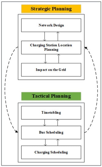 Cities are struggling to improve their public transport systems’ efficiency, especially bus transit systems. Operational processes are one of the most critical aspects of the bus transit system’s performance [9]. Bus timetabling (TT) and scheduling are among the most vital processes in bus operations. Bus timetabling aims to collect departure and arrival times for all trips and routes in the network. It seeks to maximize passengers’ satisfaction [10] through minimizing the waiting time, transferring time, increasing seat availability, etc. The process of assigning vehicles to the trips of a specified timetable is known as vehicle scheduling (VS). It aims to use the minimum number of vehicles while minimizing operational costs. Bus scheduling has a notable impact on operational costs and passenger travel times. With the increase in electric buses, a new set of scheduling and timetabling problems has emerged. Electric buses’ limited driving range and long recharging times should be considered in the studies in this field. For example, charging during off-peak hours could reduce both the fleet size and impact on the grid. Thus, timetabling and bus scheduling should be coordinated and changed regarding the new constraints of electric buses to satisfy both bus operators’ and public users’ interests. Furthermore, to improve bus schedules, a reasonable charging strategy is required [11].