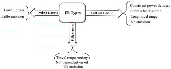 Electric buses are mainly divided into three groups, hybrid electric, fuel cell electric, and fully electric, as shown in Figure 4. The former is categorized as parallel, series, and series-parallel. In a parallel design, both the combustion engine end electric motors could propel the bus, unlike the series type, in which only the electric motor is used for the propulsion. The combustion engine supplies the energy of the electric motor. The combination of such two types is known as series-parallel, which benefits from the advantages of both types [14]. Hybrid electric buses can travel longer compared to fully electric ones, and they have very minor emissions. The issues related to this kind of bus are managing the sources of their energy and optimizing the sizes of engines and batteries. Fully electric buses only rely on electric power stored in their batteries to operate. They are not dependent on oil, so they have no emissions, and the travel range of such EBs is dependent on the capacity of the batteries. On the other hand, the high price of batteries and long charging time, along with the sparsity of charging stations, are the main issues of buses of this kind.