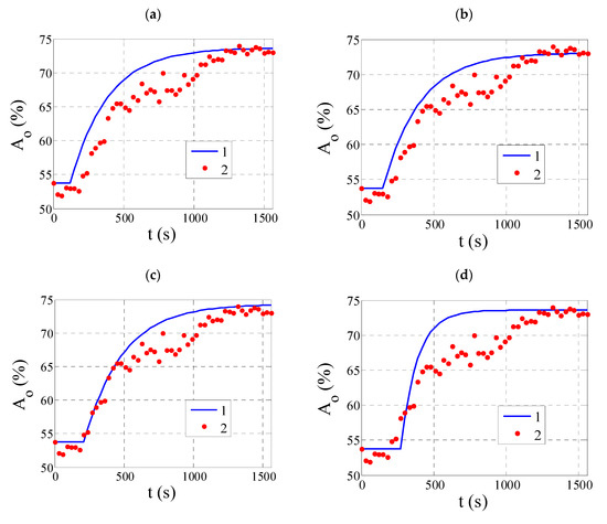 The response of the ash content of the flotation tailings to a step change in the flow rate of the flotation reagent (from a value of 1.5 dm3/h to 7.5 dm3/h). 1—object output values determined on the basis of identified dynamic models by the method with the use of Kalman filter and 2—measured data for delay times (a) 120 s, (b) 150 s, (c) 210 s, and (d) 270 s.
