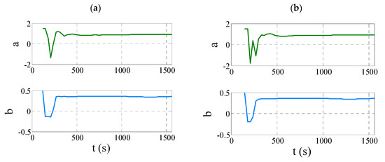 Analysing the other results summarized in Table 1, one may see that for 𝜏 = 210 s the difference in the values of the parameters a estimated using the Kalman filter—based method and the reference method (LS)—is negligible. This translates directly into the values of the time constants T, which are 275.0 s and 277.4 s, respectively. In this case, however, the difference in the values of the parameter b is not negligible, as it leads to an overestimation of the gain k to the disadvantage of the KF method. The waveforms of the continuously identified coefficients a and b, shown in Figure 7c, (when 𝜏 = 210 s) show that the values of these parameters have not settled. This may be indicative of insufficient computation time, and hence experimental time, required to achieve the final result, which, in turn, may have been the cause of the incorrect value of the coefficient k. It seems that extending the experimental time in this otherwise isolated case could have had a beneficial effect on the final result. However, it should be emphasized that this problem did not occur in any of the other cases, and the identified parameters a and b with the use of the Kalman filter have always reached the set values (Figure 7).