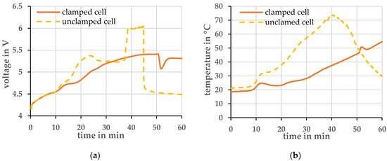 Preliminary investigations were first carried out to determine the reproducibility of the measurements. In Figure 1 the temporal evolution of cell voltage and temperature of a 1 C overcharge of a clamped and an unclamped cell is shown. The temperature was measured with a type K thermocouple centered on the surface of the pouch foil. The measurements clearly showed that cells that are mechanically clamped provided more reproducible results. Therefore, all further experiments were carried out with cells clamped with a pressure of 0.08 MPa.