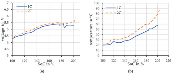 After establishing that the experiment is well repeatable until the pouch cell opens, the overcharge current was varied. An overcharge with a current of 1 C was compared to an overcharge with a current of 2 C. The voltage and temperature profiles are plotted over the state of charge (SoC) in Figure 3. Here, the SoC was calculated by the integral of the current over time.