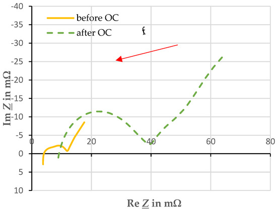 Figure 5 shows a typical comparison between the EIS before and after overcharging in a Nyquist diagram. From preliminary tests, it was found that the frequency range under investigation needed to be shifted after overcharge. Before overcharging, the x-axis crossing and thus the purely resistive part of the impedance could be recorded at about 1 kHz. After overcharging, this is at approximately 9 kHz. Thus, the frequency range was shifted from 5 mHz–5 kHz before overcharging to 100 mHz–10 kHz after overcharging to be able to analyze the characteristic points of the traces.