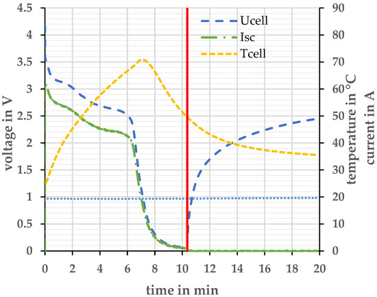 The following results were obtained from experiments carried out at a short-circuit resistance of 66 mΩ and a duration of 10 min (the test specified in IEC 62133-2 [11]). The ambient temperature was varied in the two test scenarios to 20 °C and 50 °C. A sampling rate of 3 values per second was selected. Figure 6 shows the voltage, current, and temperature profile of a short circuit test at an ambient temperature of 20 °C.