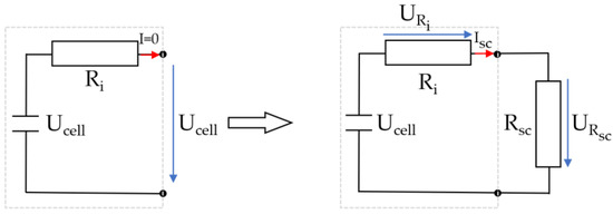 During the short circuit experiment, the open circuit voltage cannot be measured. Therefore, the cell voltage Ucell is measured prior to the short circuit. The short circuit switch was closed at t = 0 min. When the short-circuit switch is closed, the cell is loaded, and the voltage drops across the internal resistance of the cell. The peak short-circuit current Isc is 62.47 A and causes a voltage drop of 0.56 V. This voltage drop must be considered when determining the SoC. Figure 7 explains the relationship between internal resistance and short-circuit resistance.
