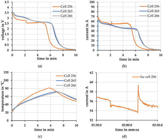 Differences were found when repeating the experiment on three cells. Two cells behaved similarly during the external short circuit. In Figure 8 no significant deviations in the (a) voltage-, (b) current- and (c) temperature profiles are evident between cells 263 and 266.