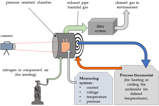The flameproof enclosure consists of a chamber with a structure for contacting pouch cells. Due to the possibility of moving the terminal blocks, different pouch cell formats can be contacted. The electrical connections are led to the outside via copper bushings. The enclosure has a gas inlet and gas outlet valve to enable a purging process and to wash the resulting gas sufficiently so it can be safely released into the environment. Thermocouples for temperature measurement and measuring leads for voltage monitoring can be fed into the housing via suitable flameproof bushings. The housing is closed with a screw-on cover with a viewing window. A temperature-controlled base plate allows the housing to be regulated to a temperature of 5–50 °C by using a thermostat.