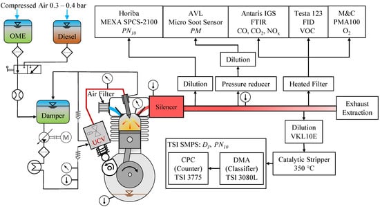 All reference measurements have been performed with fossil diesel fuel, which fulfills the requirements of EN 590 [53]. The exact composition of the investigated OME () and other properties of both fuels can be found in Table 1.