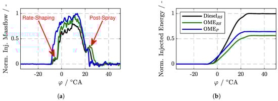 In this work, two different injectors with a different injection rate curve in OME operation are investigated. The first nozzle is the rate-shaping (RS) nozzle used in the production engine, and the second nozzle is a proportional-opening (P) nozzle. The RS-nozzle is equipped with a needle lift sensor (Section 2.2.3) for the OME and diesel measurements. The injection rate curves and the injected energy of the two nozzles are shown as an example for an operating point with identical injection parameters in Figure 2 and were recorded with an HDA injection rate analyzer from Moehwald GmbH. The P-nozzle shows a nearly rectangular shape of the injection rate, whereas the RS-nozzle limits the flow during the opening process (Rate Shaping) and shows a pronounced increase in the injection rate during the closing process (Post-Spray). The limited flow during the nozzle opening of the RS-nozzle acts as a kind of pre-injection and is intended to reduce exhaust and noise emissions during diesel operation. The higher mass flow through the RS-nozzle with OME can be explained by the higher density of OME compared to diesel. Due to the higher bulk modulus and the lower viscosity of OME (Table 1), a slight elongation of the injection duration occurs for the RS-nozzle, despite the same [57,58]. With the normalized injected energy in Figure 2b, it can be seen that due to the lower LHV of OME, significantly less energy is injected for both nozzles for the same solenoid valve actuation time. The P-nozzle injects more mass for the same actuation time, but not enough to fully compensate the difference in LHV between OME and diesel. Therefore, the needs to be extended with OME.