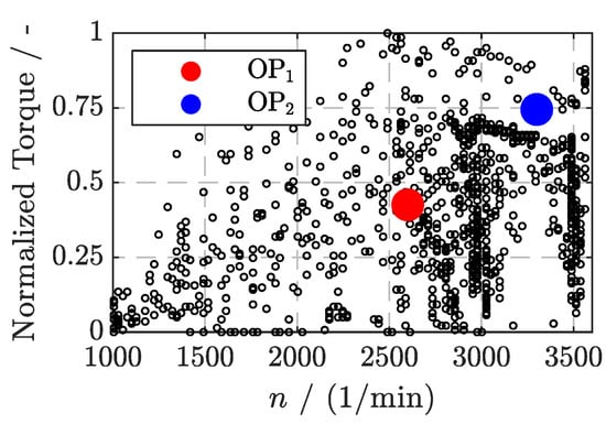 Table 3 shows the operating points (OP) of the engine tests. At each OP, the engine is controlled to constant speed (n) and break mean effective pressure (). At constant , the INCA application software was used to adjust the start of energizing () until the angle at which 50% of the injected fuel mass is burned ( 50%), also called center of combustion (COC), matches the values shown in Table 3. The test stand controller adjusts the foot pedal position, and thus the , until the remains constant. The variation limits of the 50% are given by a maximum cylinder pressure of 70 bar and an unstable combustion at late 50% positions. Therefore, at high loads and speeds, the number of measurement points must be reduced. Due to hydraulic instabilities and the resulting unstable combustion when using the P-nozzle, the measurement point with 50% = 8.1 CA ATDC at OP could not be recorded. The reasons for this behavior could be the increased stiffness in the low-pressure circuit due to the conversion to PTFE pipes, the lower compressibility of OME and a lack of tuning of the P-nozzle to the standard injection system. The location of the investigated OPs in Non-road Transient Cycle can be seen in Figure 3.