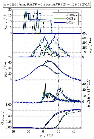 Looking at the drive current of the UCV for OP (Figure 4), it is noticeable that the UCV for both nozzles in OME operation is controlled by about 1–2.5 CA later than with diesel, although due to the lower LHV of OME, the for the same effective mean pressure must be selected significantly longer overall, and the same center of combustion must be maintained (Table 4). At late COC, the UCV is actuated up to 5 CA later for OME than with diesel. The injection pressure increases proportionally with actuation time in a PLN injection system [65]. Therefore, due to the longer , the maximum pressure in the injection line at this OP is ≈200 bar higher with OME for the RS-nozzle and ≈250 bar higher for the P-nozzle than with diesel. In addition, the higher peak pressure and a slightly steeper increase in pressure in OME operation is due to the higher bulk modulus of OME (Table 1).