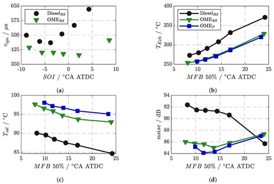 Figure 5b shows the exhaust gas temperature () for OP as a function of . The exhaust gas temperature increases with later positions of the COC, since the heat of combustion in the working process cannot be converted into mechanical work efficiently, which significantly decreases the indicated efficiency (Table 4). The lower exhaust gas temperature of OME is due to the higher exhaust gas mass flow because of the larger injection mass and the significantly higher heat capacity due to a higher concentration of water vapor and CO in the exhaust gas (CO and HO factor in Table 1). At later COC positions, the gap in exhaust gas temperature between OME and diesel combustion increases, since OME has a significantly shorter burning duration and faster burnout due to its oxygen content, resulting in more efficient combustion. Especially at late COC positions, a shorter combustion duration ensures lower wall heat losses. A further small effect for lower exhaust gas temperatures could be the slightly higher value for enthalpy of vaporization of OME [18].