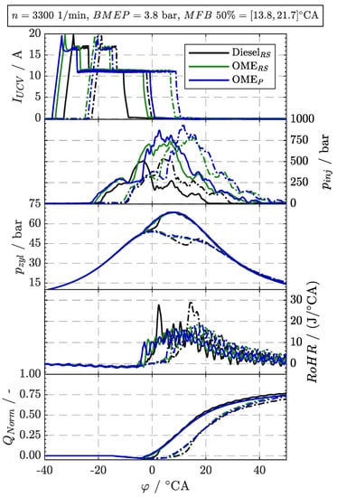 First, the thermodynamics of OME combustion and the injection system behavior are discussed in order to draw conclusions about the emissions and their formation. In Figure 4, the drive current of the UCV (), the pressure in the injection line (), the cylinder pressure (), the rate of heat release (), and the cumulative energy () normalized to the total amount of energy injected are shown for two selected at OP as a function of the crank angle (). The solid lines relate to a COC closer to the top dead center (TDC) (CA), whereas the dashed lines represent an OP with late COC (CA). Table 4 lists the measured values of the most important variables for the shown OPs and the respective combustion centers.