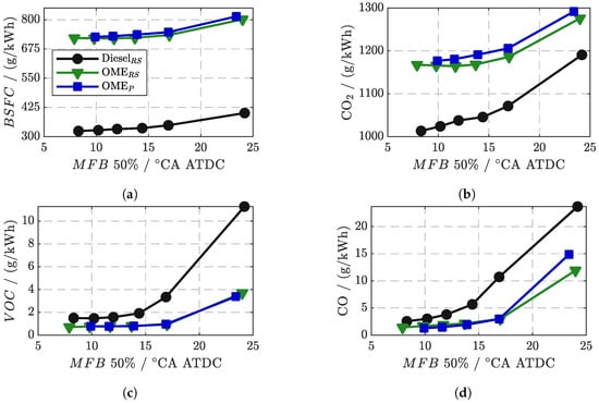 The specific effective CO emissions (Figure 7b) for OME combustion are higher than for diesel because complete combustion produces more CO due to the molecular structure (see CO factor in Table 1). The difference in CO emissions between OME and diesel decreases at late COC because diesel combustion efficiency decreases more at late COC than with OME. In order to achieve low CO emissions in a tank-to-wheel consideration with OME, the efficiency would have to be significantly increased compared to diesel operation, which only seems possible through extensive hardware adaptation or a completely new development of an engine optimized for OME. However, if the OME used is produced from renewable sources and a well-to-wheel analysis is applied, OME has a clear advantage over fossil diesel fuel in terms of the overall CO balance.
