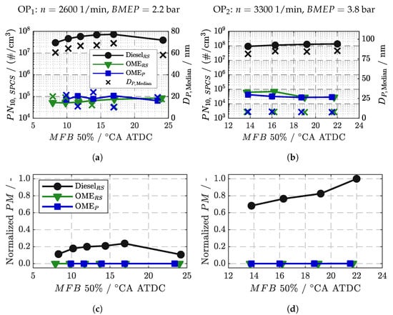 The particle number measured with the SPCS and the normalized particle mass as a function of COC for OP and OP are shown in Figure 8. At low load and medium engine speed (Figure 8a), the initially increases with diesel as the COC becomes later and decreases again at very late COC positions. The same behavior is also evident in the median of the particle mobility diameter () (Figure 8a, right axis). Due to the shift of combustion to the expansion phase, mixture formation is negatively affected by lower temperatures and combustion chamber pressures, which is why zones with rich mixture occur more frequently in the combustion chamber. This results in an increased formation of soot particles and promotes agglomeration into larger particles at low temperatures [79]. In addition, the oxidation reaction stops during the expansion phase due to low temperatures. The reduction in particle number at very late COC and with diesel can be explained by the high conversion rates due to a large premixing fraction (see Figure 4). Due to a very long ignition delay phase, a partially homogeneous mixture is formed in the combustion chamber which burns at a high conversion rate, resulting in fewer rich zones and a higher oxidation rate than the pyrolysis rate because of high temperatures [80].