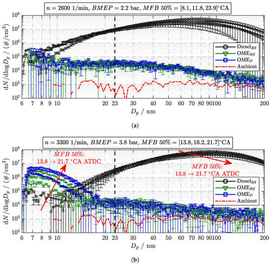 At higher load and engine speed (Figure 9b), with OME (both nozzles), the particles in nucleation mode increase compared to diesel, and a further increase in particle number is observed as the COC is shifted toward late timings. At higher engine speeds, less time is available for mixture formation, and the decreases with increasing load due to the larger injection mass, causing the to increase. At the same time, the temperature level increases, and therefore, the primary particle size decreases with engine load because of improved oxidation compared to OP [81]. Due to the significantly increased actuation time and high injection pressure with OME at high load, it is possible for the injection jet to impinge on the piston or cylinder wall, washing off and burning engine oil. Dworschak et al. [52] also observed an increase in particle number in nucleation mode and a bimodal size distribution at unfavorable operating conditions (idle and full load) in engine tests with OME and also suspect a combustion of engine oil due to unfavorable operating conditions.