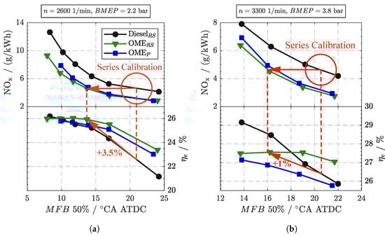 Therefore, the aim of this work is to investigate the potentials of OME on a low-cost close-to-production naturally aspirated non-road diesel engine with a pump–line–nozzle (PLN) injection system without EGR. This article shows the results from experiments with a OME mixture (further only called OME) and diesel as a reference. The influence of a variation of the center of combustion (COC) on NO, particle number (), particulate matter (), volatile organic compounds () and carbon monoxide (CO) formation, particle size distribution (PSD), combustion noise, efficiency () and ignition delay () is shown for OME and diesel at two different operating points (OP). The results of the variation of the COC are subjected to a detailed thermodynamic analysis with consideration of friction and heat losses. For OME, the influence of two nozzles with different injection rate curves on combustion and the influence of physical properties of OME on the hydraulics of the PLN injection system is discussed. An approach for the more accurate determination of ignition delay using a needle lift sensor on the engine is presented, and the results are shown using the series nozzle as an example. Finally, the potential for efficiency improvement through calibration as a result of reduced NO emissions with OME is discussed for the close-to-production engine.