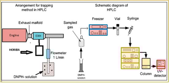 The automotive industry focuses on diesel engines due to their high performance of the diesel engines and their high durability with an excellent fuel economy; throttling losses are lower than spark ignition engines. The problem of compression ignition diesel engines is the huge amount of diesel emissions released such as NOx, particulate matter, and soot particles, compared to SI engines [,,]. Diesel engines are popularly termed a reliable CI engine, and gained this reputation over the years for their ability to emit lower hydrocarbon with better fuel economy and lower maintenance costs. On the other hand, CO, NOx, and particulate matter emissions released from diesel combustions are highly dangerous for the environment, human health, and the atmosphere [,,]. The purpose of diesel engine tailpipe emissions is to control carbon monoxide, HC, and NOx. Uncontrolled chemical species such as carbonyl aldehydes, olefins, alkanes, and particulate matter emissions are always of interest to diesel emission researchers. In addition to associated organic matter, toxic air emissions from automotive emissions are primarily composed of the organic compounds 1,3-butadiene, acetaldehyde, formaldehyde, benzene, particulates, as well as olefins chemical compounds, such as 1,3-butadiene and formaldehyde, that have a high atmospheric reactivity in urban areas. Many chemical species emissions, originating from exhaust gases, such as aldehydes and alkanes and alkenes, are considered to be intermediate species during the combustion process; these processes are an important target for researchers to provide a valuable research information and theoretical platform for future scientific database [,]. These days, there is a strong regulation and more restrictions on the emission of gases such as NOx, HC, CO, and PM, but unfortunately no serious restrictions or real regulations to control unregulated emissions. In fact, unregulated hydrocarbon emissions are considered to be more dangerous to human health and the environment than regulated HC. Under certain conditions, these chemical species could produce photochemical smog accompanied by plenty of ozone quantity [,,]. For example, high-performance liquid chromatography (HPLC) and gas chromatography-mass spectrometry (GCMS) tools are highly beneficial to the detection of aldehydes and the analysis of unburdened hydrocarbons such as HC, especially in the medical and atmospheric fields. There are many compounds that have been reported to be carcinogenic, such as formaldehyde, acetaldehyde, and benzaldehyde [,]. For the detection of aldehydes and ketones in different tested samples, it is very practical to derivatize them with 2,4-dinitrophenylhydrazine (DNPH) and then perform high performance liquid chromatography (HPLC) on the product. The 2,4-dinitrophenylhydrazine derivatives have been separated for detection using UV/VIS, diode array, and mass spectrometric detectors [,]. Urban areas dominate the polluted air in field; formaldehyde and acetaldehyde, with similar aldehydes, are potential contributors to forming photochemical smog. Increasing regulated and unregulated emissions could face more restrictions and new regulations in the automotive industry in the future [,,]. Many researchers are focusing on an after-treatment system and new techniques to be used to minimize engine tail pipe emissions and reduce the effect of these gases in the atmosphere. New pressure techniques called high-pressure injection are used to reduce harmful emissions. The strong regulations imposed on the car industry encourage researchers to work harder to achieve an after-treatment system along with in-cylinder emission reduction technologies to minimize harmful emissions to minimum levels [,,].