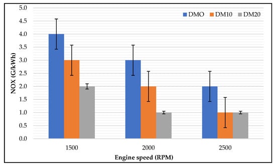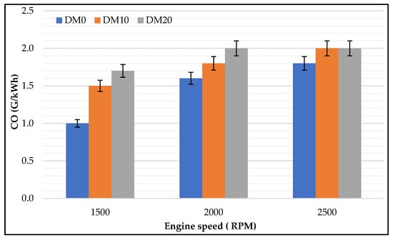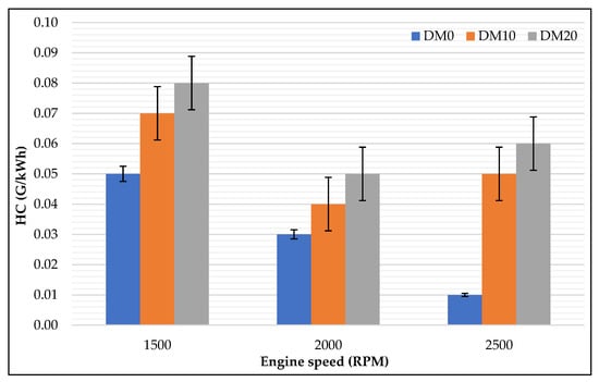 The formation of unburned HC in CI diesel engines is an indicator of poor combustion efficiency, as complete combustion will reduce HC emissions. As seen in Figure 3, with pure diesel, HC is highly influenced by increasing engine speeds. Increasing engine speeds leads to decreases in HC emissions; when the speed increased, the intake and exhaust valves opened and closed faster, the air was replenished in a timelier manner, and the fuel was fully burned, reducing the emission of HC compounds. This phenomenon regarding engine speed was also found in some studies [,,]. On the other hand, using diesel and blended fuels (Figure 3) showed a higher HC emission from DM10-DM20 compared to pure diesel, which is attributed to a combined rezone of relatively higher latent heat of vaporization, and slower flame-speed, which could cause a higher degree of incomplete combustion of fuel which is closed to the cylinder wall.