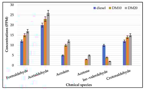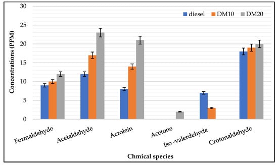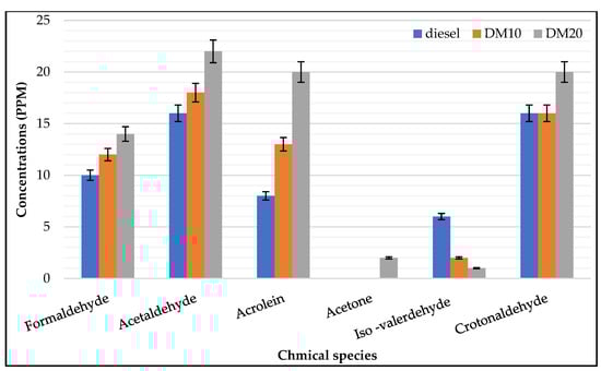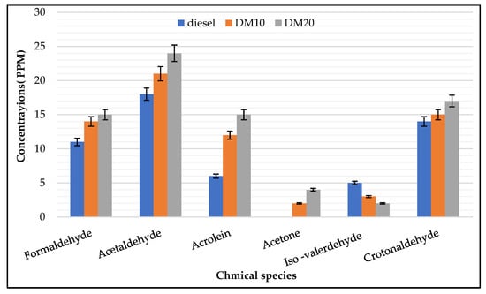 At lower engine loads (Figure 5), iso-valerdehyde had the highest concentrations when pure diesel was used and was reduced about 30% at a higher engine load. Alternatively, with blended fuel, the iso-valerdehyde concentration was reduced about 50% at all engine loads (Figure 5, Figure 6, Figure 7 and Figure 8).