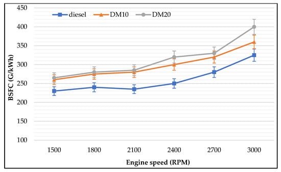 The influence of different fuels on the brake BSFC with respect to engine speed are shown in Figure 9; by increasing engine speeds with a constant load, BSFC becomes higher for all used test fuels. Blended fuel 20% showed a higher BSFC compared to pure diesel. BSFC values of blended fuel 10% and 20% methanol were higher than those of pure diesel fuel at all engine speeds. This is related to the HHV of diesel fuel compared to diesel blended fuel. LHV of the blended fuel leads to greater BSFC compared to diesel fuel.